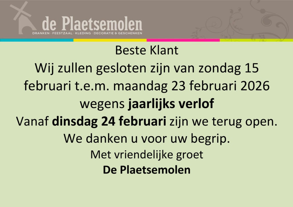 Ontdek bij de Plaetsemolen de volledige feestbeleving van uw dromen! Met onze drankencentrale, ruime feestzaal, stijlvolle kledingwinkel, prachtige decoraties en unieke geschenken bent u bij ons aan het juiste adres voor het organiseren van een onvergetelijk feest. Bij ons kunt u rekenen op de allerbeste service en kwaliteit.